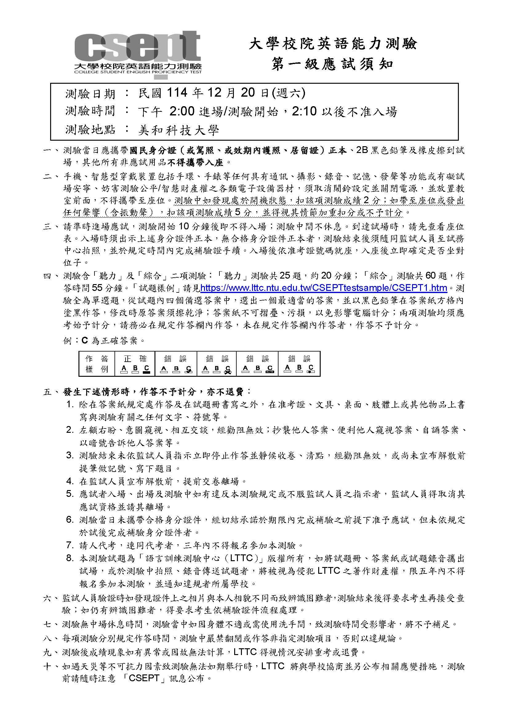 2. 測驗含「聽力」及「綜合」二項測驗,「試題樣例」請見語言訓練測驗中心網頁https://www.lttc.ntu.edu.tw/CSEPT1.htm